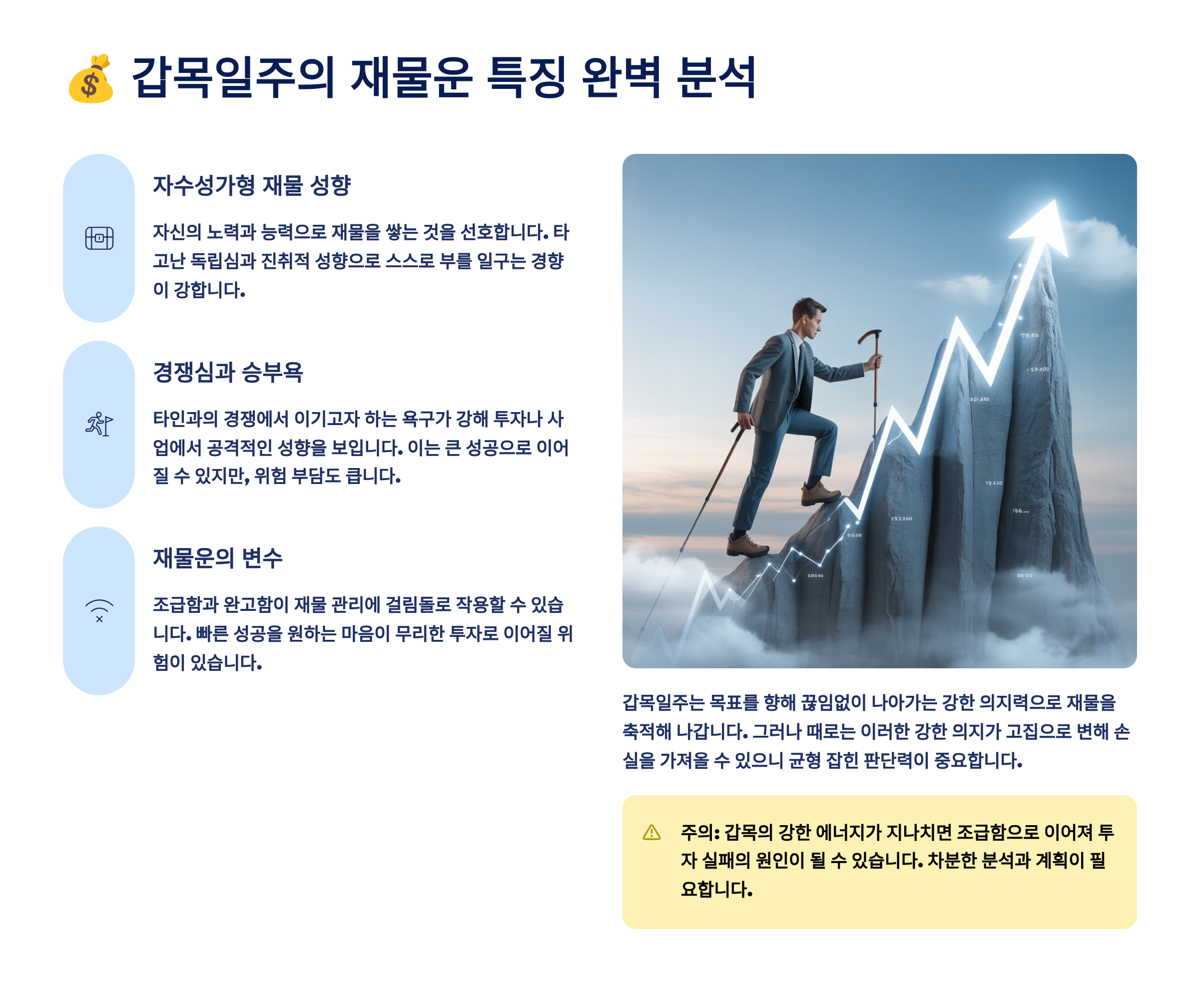 | 특성 | 긍정적 측면 | 주의할 점 | 재물운 영향 |