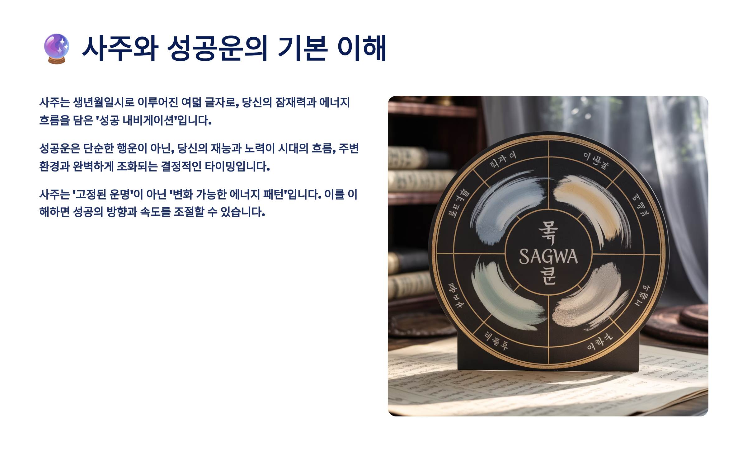 사주는 태어난 연월일시를 바탕으로 한 사람의 운명과 성향을 분석하는 동양의 오랜 학문이에요. 특히 성공운의 흐름을 파악하면 인생의 중요한 기회를 놓치지 않고 최대한 활용할 수 있답니다. 오늘은 사주를 통해 성공운이 찾아오는 시기와 그 특징들을 자세히 알아볼게요.