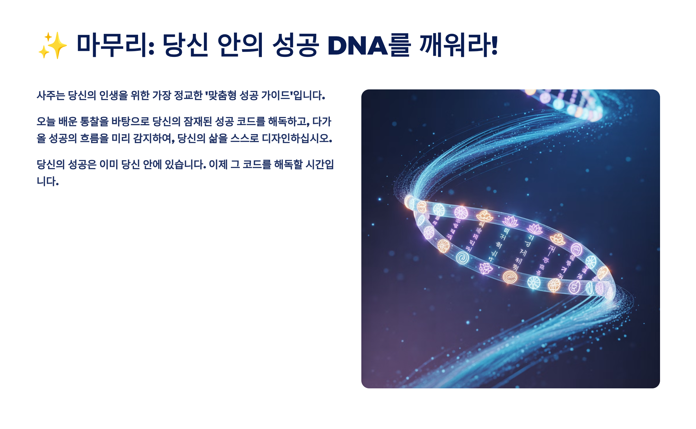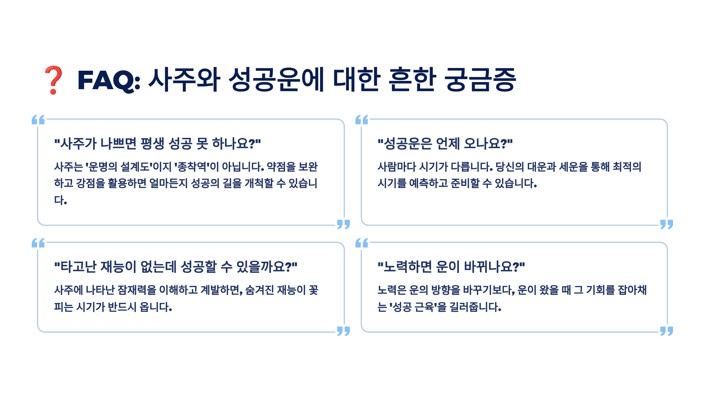성공운은 하늘이 주는 선물이지만, 그것을 받아들이고 활용하는 것은 전적으로 우리의 몫이에요. 준비된 사람에게만 기회가 보이고, 노력하는 사람에게만 성공의 문이 열린답니다. 사주는 가능성을 보여주는 지도일 뿐, 실제로 그 길을 걸어가는 것은 여러분 자신이에요.