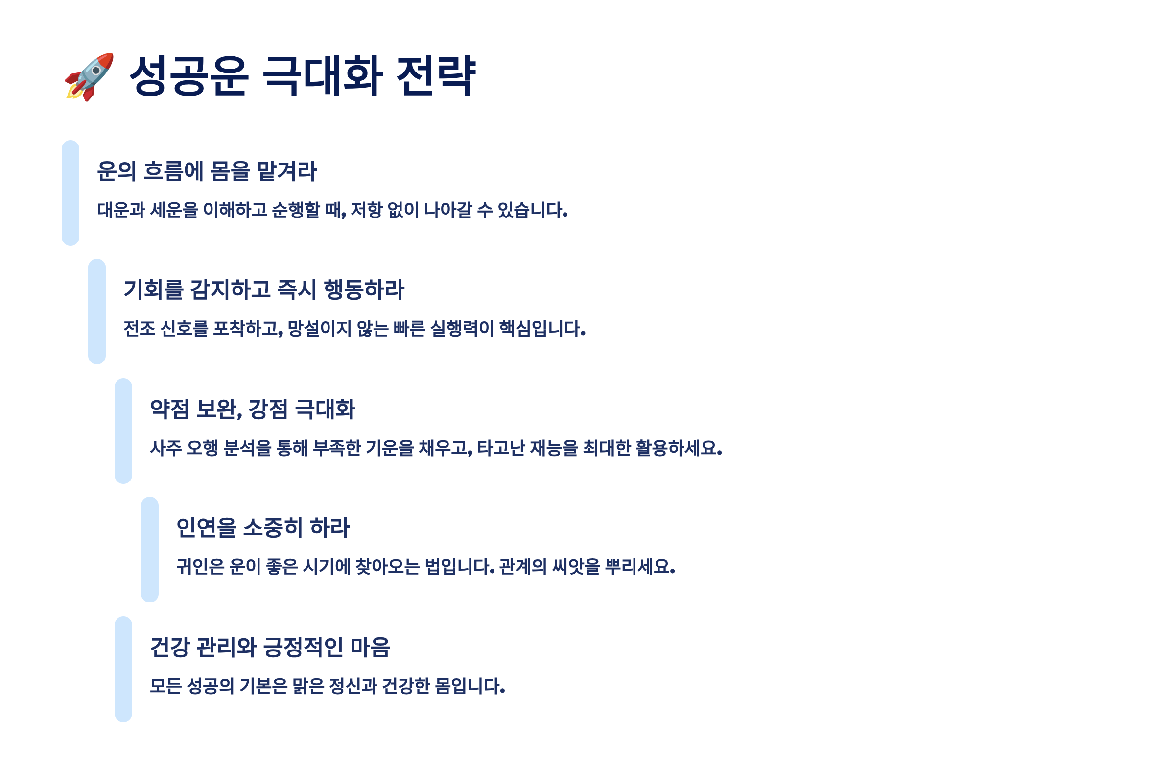 성공운을 극대화하려면 먼저 자신의 용신을 정확히 파악해야 해요. 용신은 사주에서 가장 필요하고 도움이 되는 오행으로, 이를 보강하면 운이 크게 상승해요. 예를 들어 화(火)가 용신인 사람은 붉은색 계열의 옷을 입거나 남쪽 방향으로 활동하면 도움이 된답니다.
