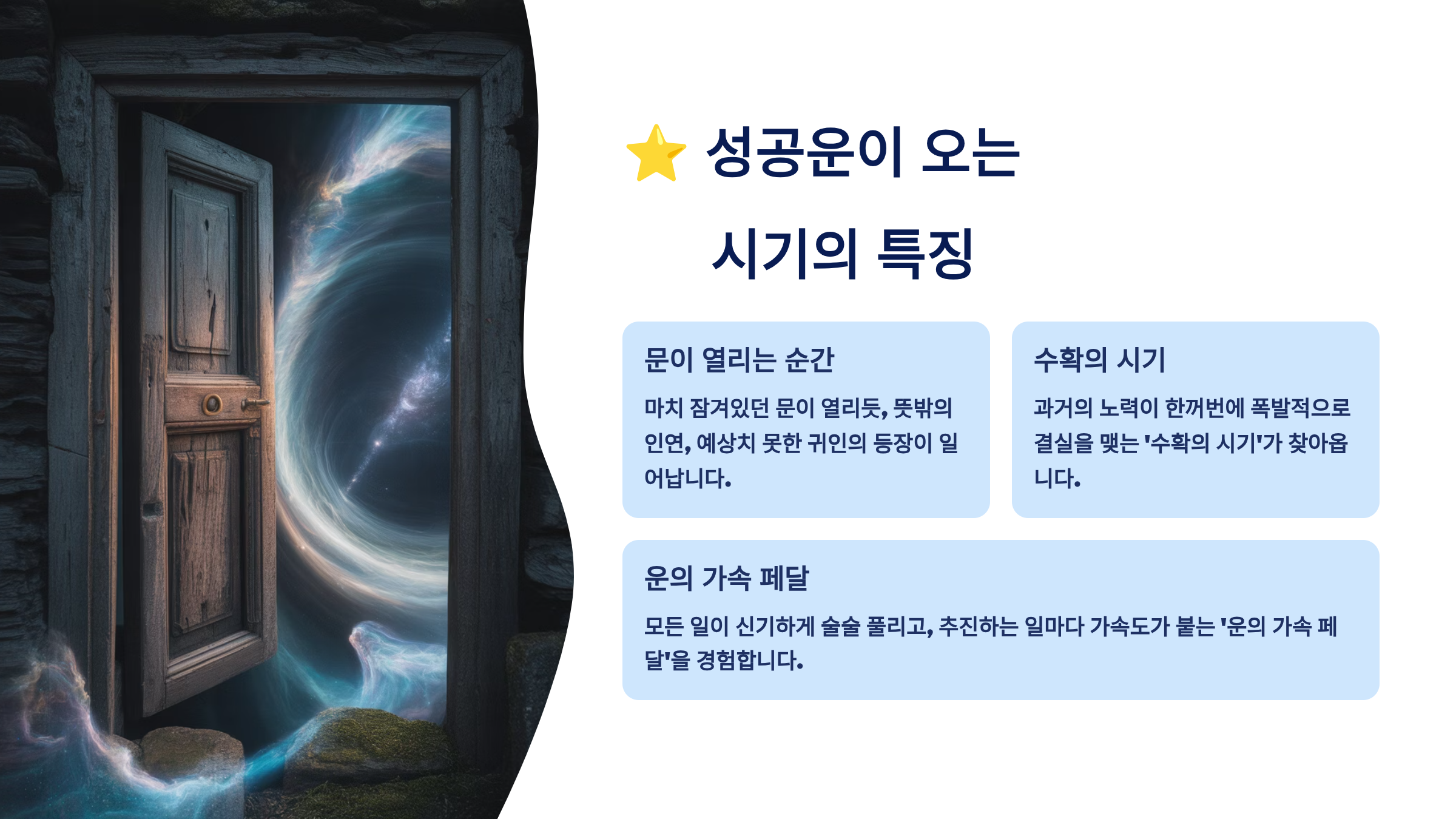 성공운이 올 때는 우연의 일치가 자주 일어나요. 필요한 정보를 우연히 얻게 되거나, 막막했던 문제의 해결책이 갑자기 떠오르기도 해요. 이런 현상을 동양철학에서는 '천시(天時)'라고 부르는데, 하늘이 때를 알려준다는 의미랍니다. 🌈