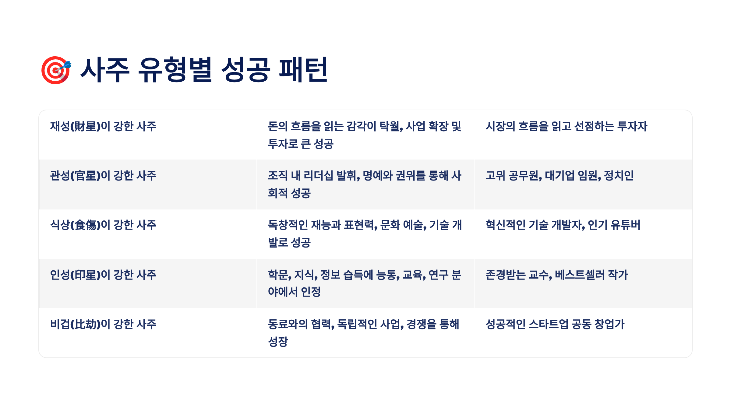 | 사주 유형 | 성격 특징 | 적합 직업 | 성공 전략 |