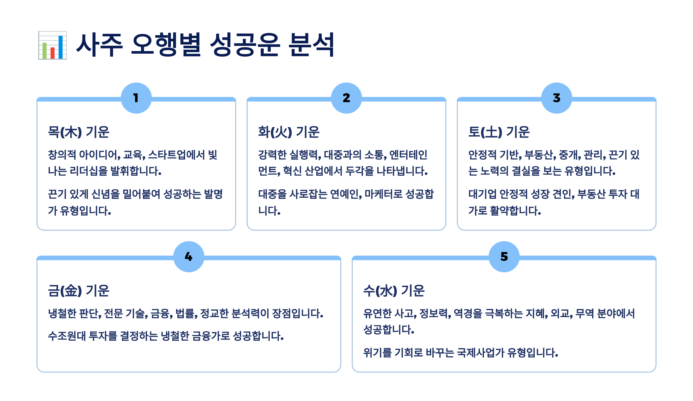 | 오행 | 상생 관계 | 상극 관계 | 성공운 특징 |
