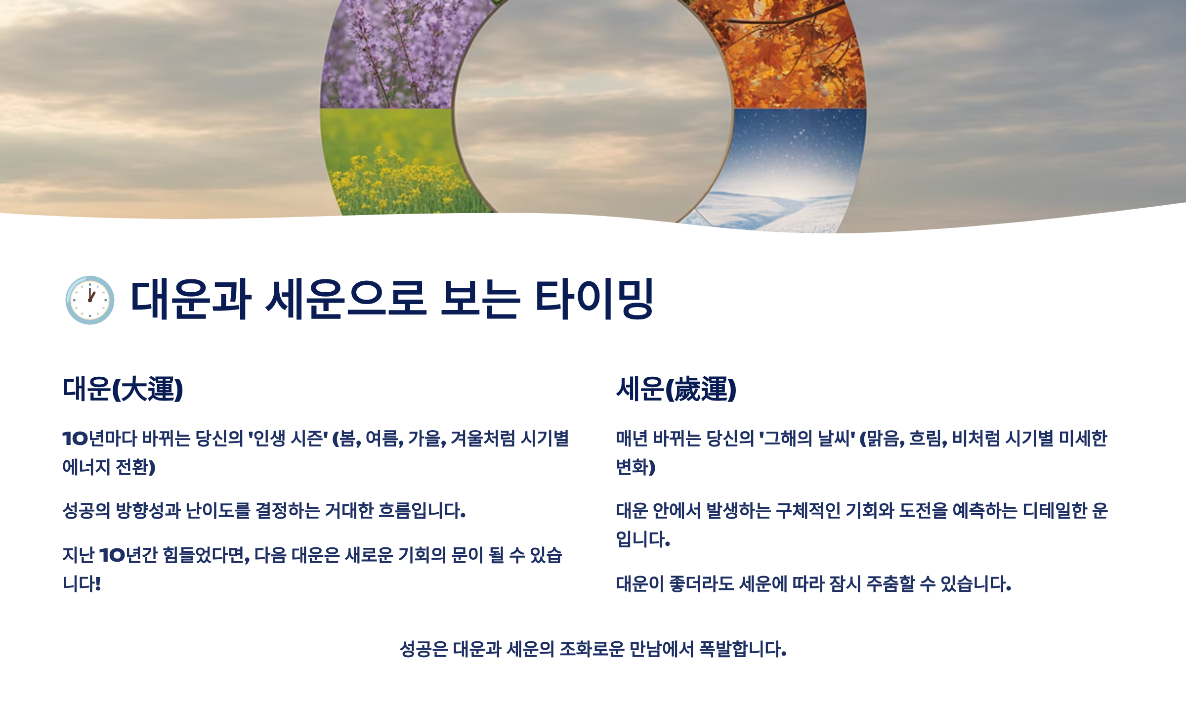 타이밍을 읽을 때는 개인의 리듬도 중요해요. 어떤 사람은 봄에 에너지가 넘치고, 어떤 사람은 가을에 집중력이 높아져요. 이는 사주의 계절적 특성과 관련이 있는데, 자신만의 바이오리듬을 파악하면 더 효과적으로 성공운을 활용할 수 있어요! 📈