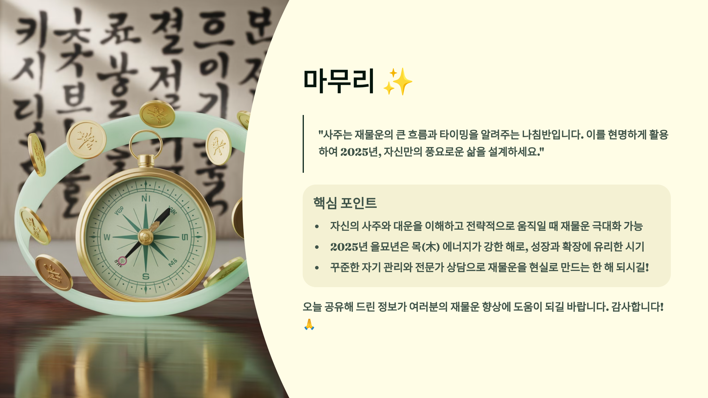 지금까지 사주에서 재물운이 강한 일주와 재물 흐름이 좋은 사주의 특징에 대해 자세히 살펴보았어요. 갑자일주, 임인일주 같은 타고난 재물복이 있는 일주도 있지만, 더 중요한 것은 자신의 사주를 정확히 이해하고 운의 흐름을 파악하는 것이에요. 2025년 을사년은 특히 금일간과 수일간에게 좋은 재물 기회가 찾아올 것으로 예상되니, 철저한 준비로 기회를 놓치지 마세요.