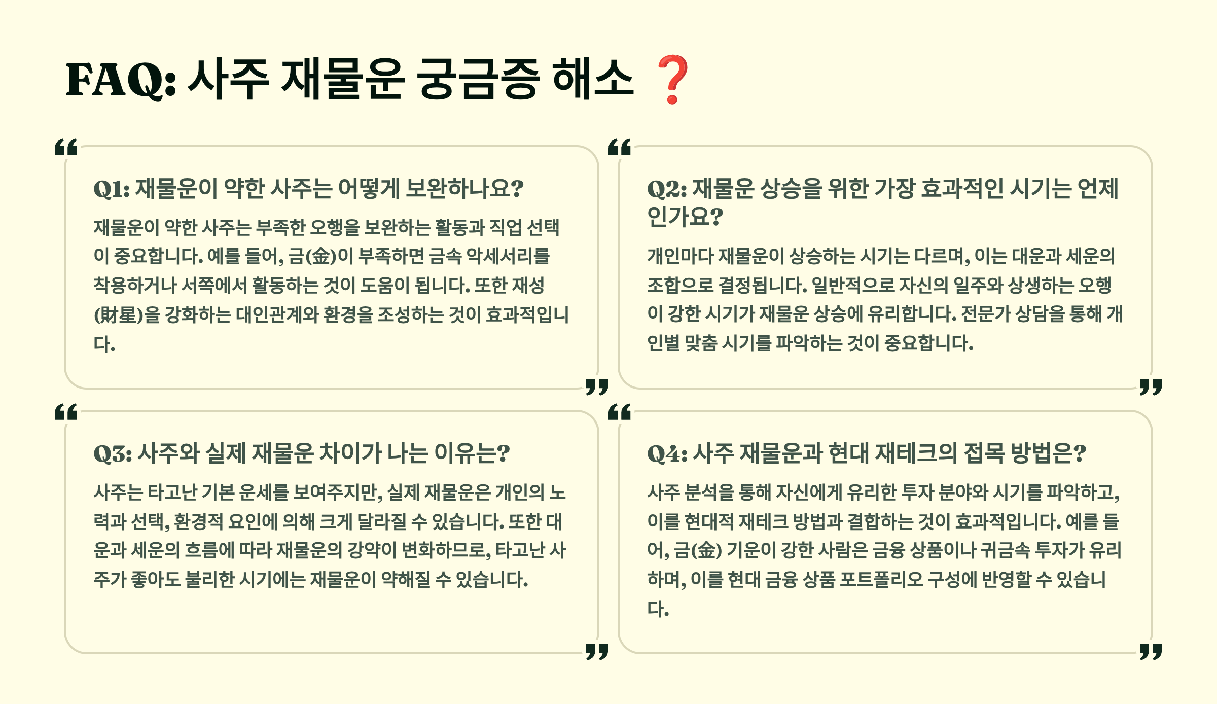 A5. 첫째는 자신의 사주를 정확히 파악하는 것, 둘째는 용신을 보강하는 것, 셋째는 운의 흐름에 맞춰 행동하는 것이에요. 여기에 꾸준한 자기계발과 긍정적인 마인드셋을 더하면 재물운이 크게 상승할 수 있어요.