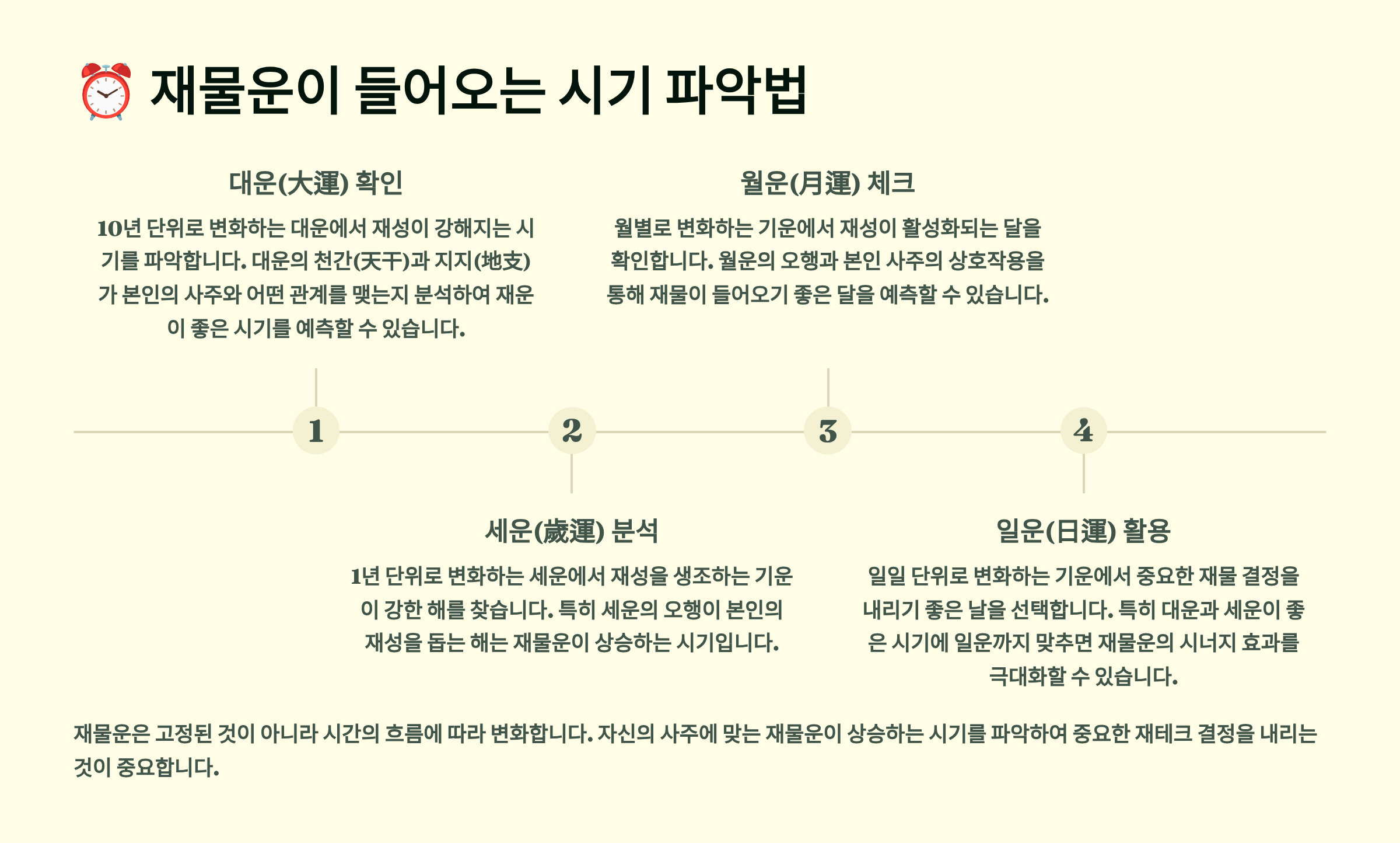 아무리 좋은 재물운을 타고났어도 시기를 놓치면 기회를 잃을 수 있어요. 사주명리학에서는 대운(大運)과 세운(歲運), 월운(月運)을 통해 재물운이 들어오는 시기를 파악할 수 있답니다. 이런 운의 흐름을 이해하면 언제 투자하고, 언제 조심해야 할지 알 수 있어요.
