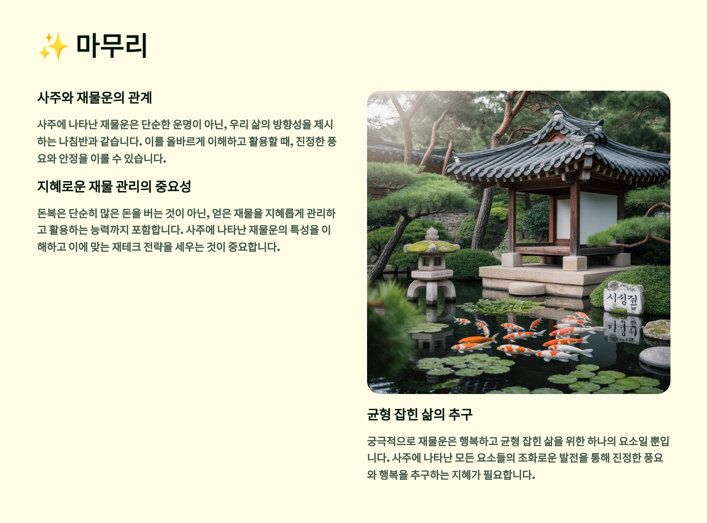 본 콘텐츠는 전통 사주명리학의 일반적인 해석을 바탕으로 작성되었으며, 개인의 미래를 확정적으로 예측하거나 투자 조언을 제공하는 것이 아닙니다. 사주는 참고 자료일 뿐이며, 실제 재물운은 개인의 노력, 선택, 환경적 요인에 따라 크게 달라질 수 있습니다. 중요한 재정적 결정을 내릴 때는 반드시 전문 재무설계사나 투자 전문가와 상담하시기 바랍니다. 사주 해석은 문화적 전통의 일부로 받아들이시고, 맹신하지 마시기 바랍니다.