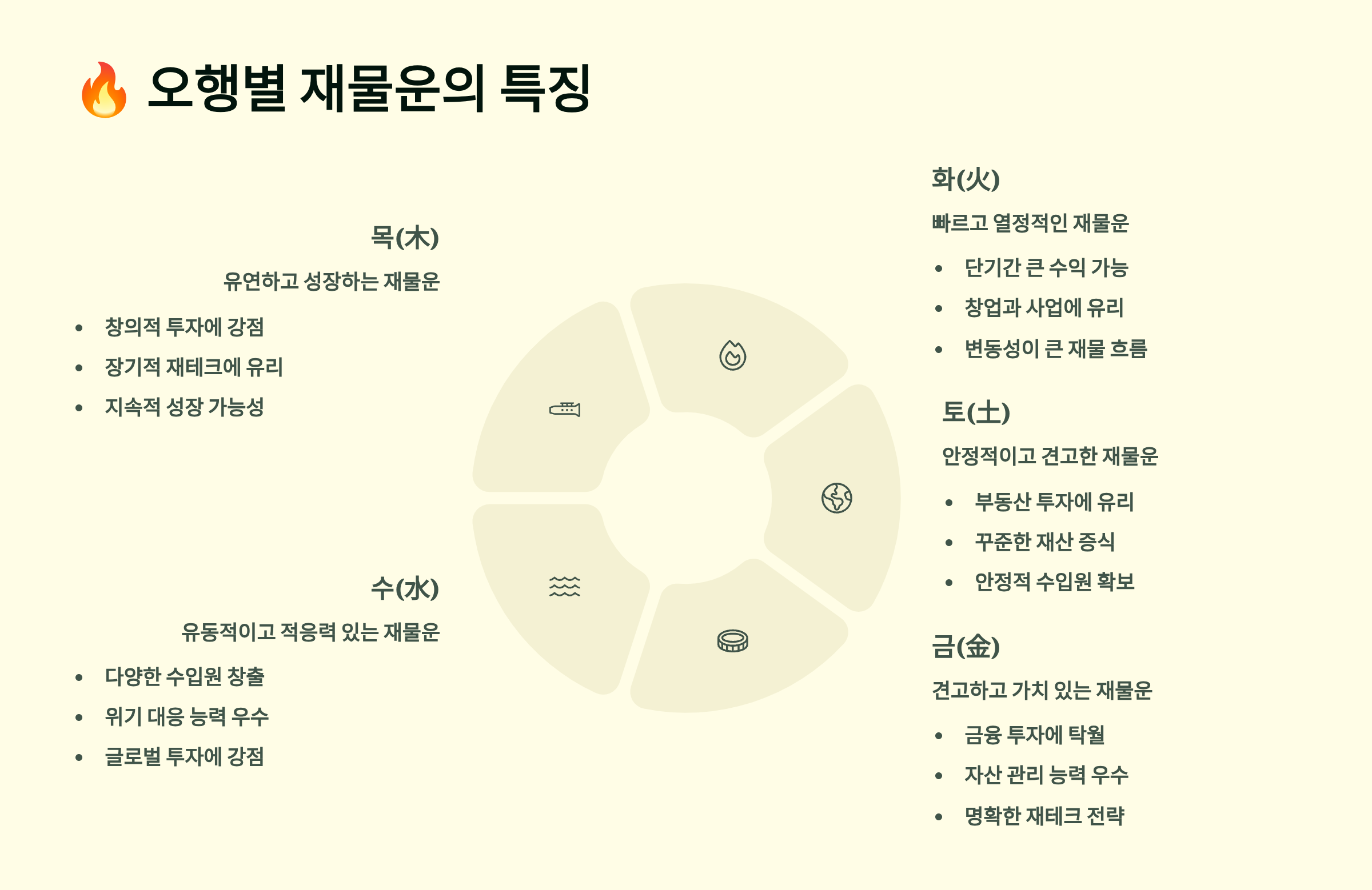 | 오행 | 재물 성향 | 유리한 분야 | 투자 스타일 |