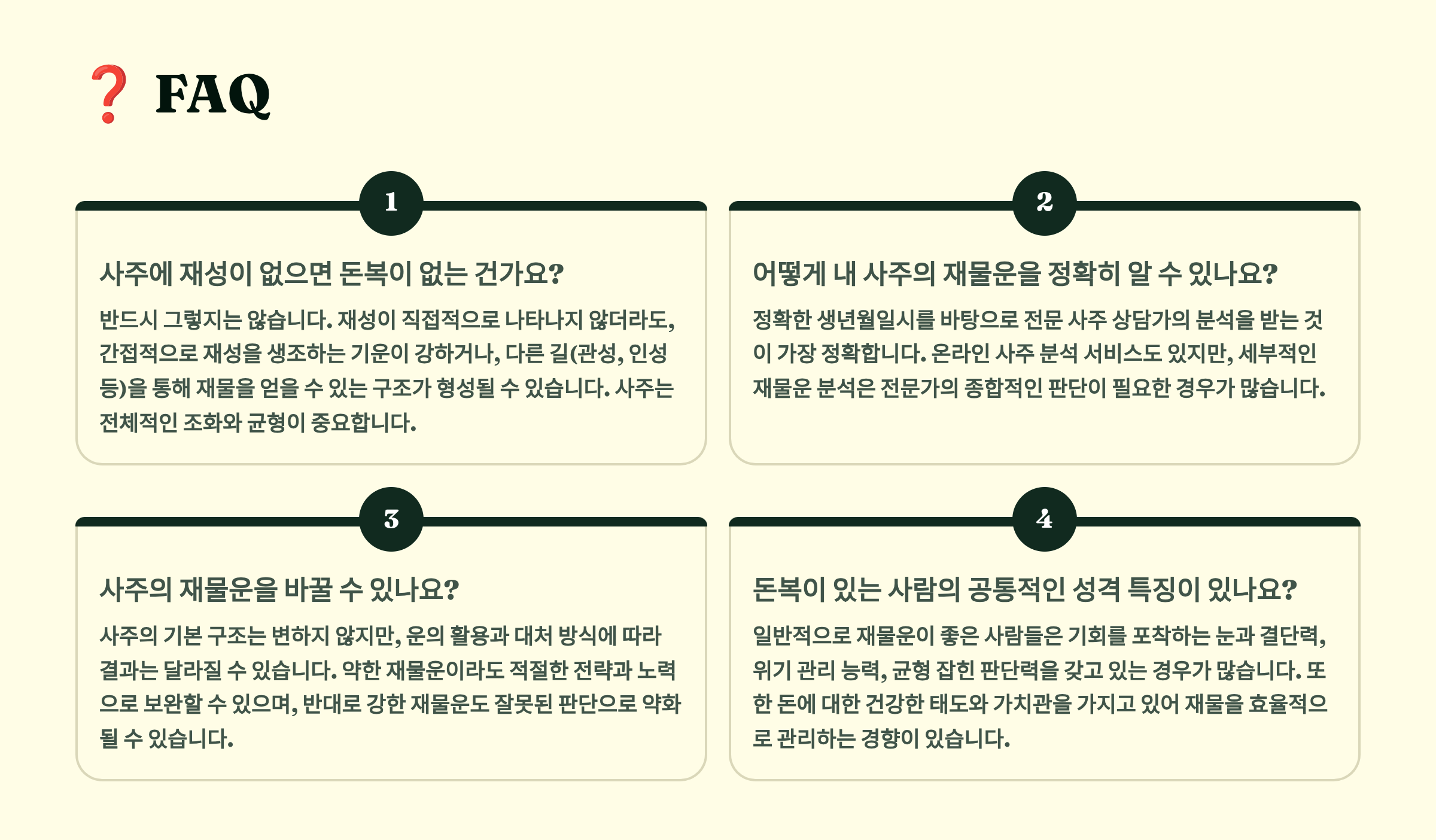재물운이 강한 사주를 타고났다고 해서 노력 없이 부자가 되는 것은 아니에요. 반대로 재물운이 약해 보이는 사주라도 꾸준한 노력과 올바른 선택으로 충분히 경제적 성공을 이룰 수 있어요. 사주는 가능성을 보여주는 것이지, 확정된 미래를 말하는 것이 아니랍니다.