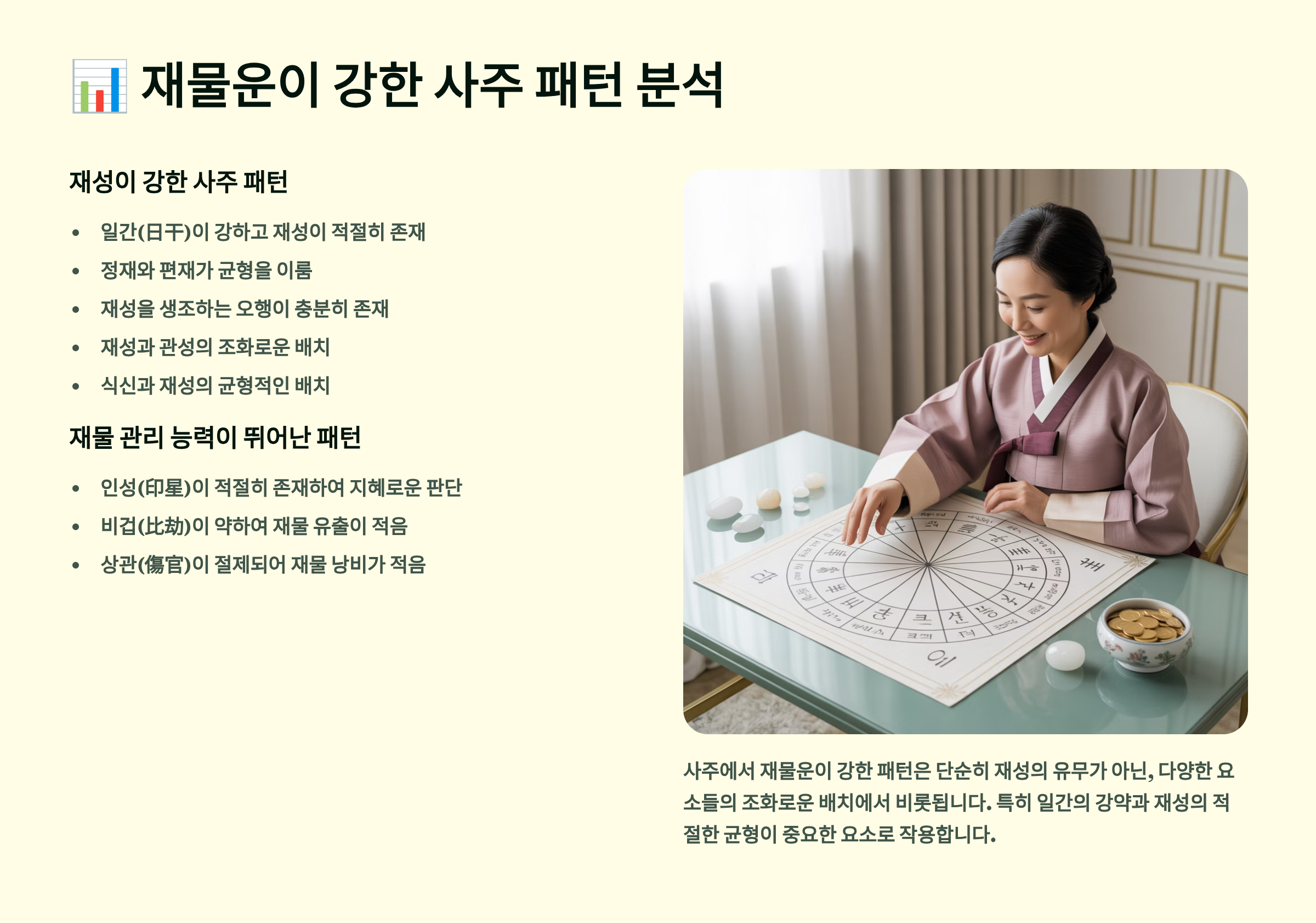 마지막으로 '대운 재성 30년' 패턴이 있어요. 타고난 사주는 평범해도 30대부터 60대까지 계속 재운이 들어오는 경우예요. 이런 사람들은 인생의 황금기에 집중적으로 부를 축적할 수 있어요. 중요한 것은 이 시기를 놓치지 않고 적극적으로 활동하는 것이랍니다! 🎯