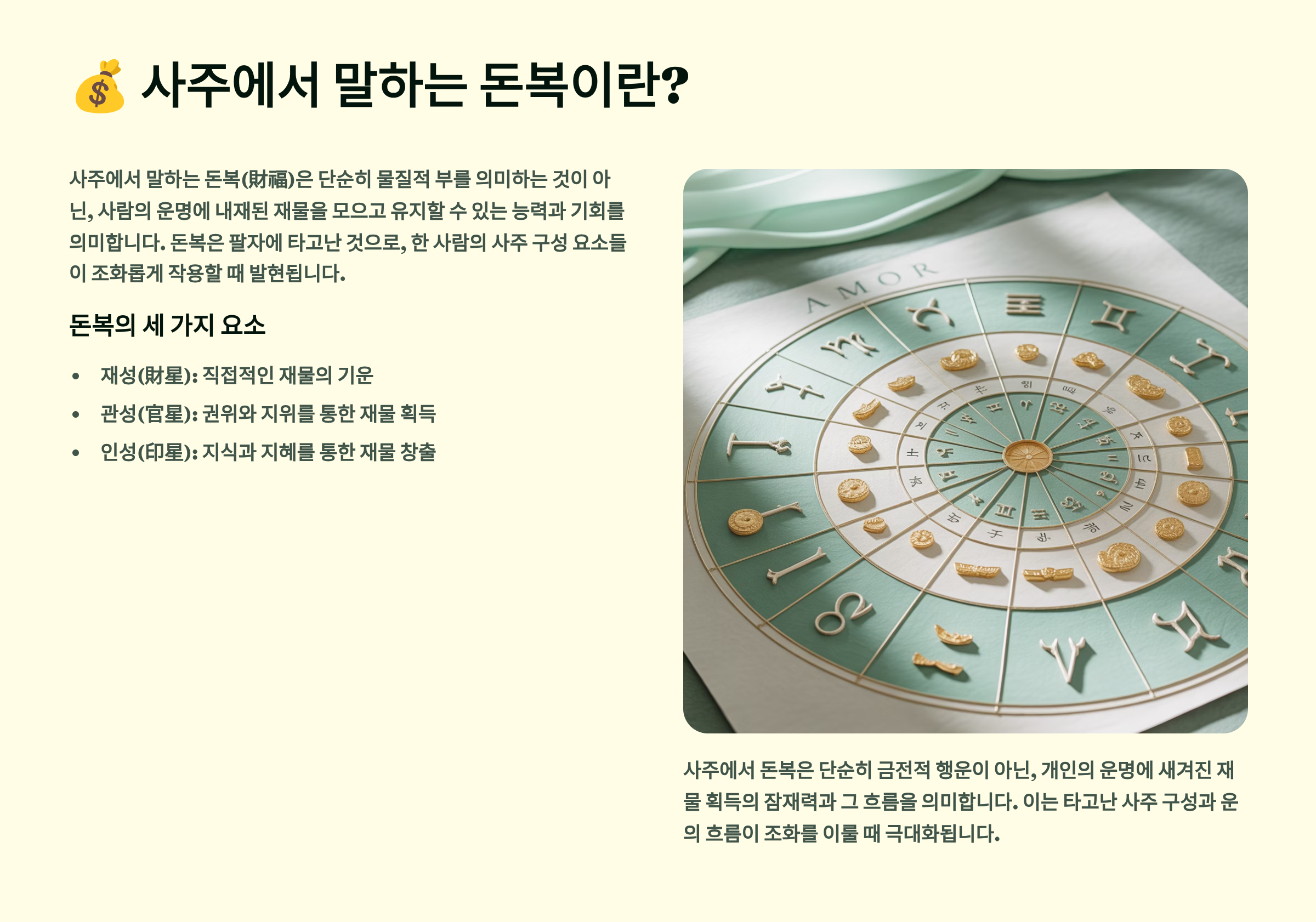 2025년 현재 경제적 불확실성이 커지면서 사주를 통한 재물운 분석에 대한 관심이 더욱 높아지고 있어요. 오늘은 전통 사주명리학의 관점에서 돈복이 있는 사람들의 사주 특징과 재물운이 강한 사주의 공통점을 자세히 살펴보고, 실생활에서 활용할 수 있는 방법까지 알아보도록 할게요! 💰