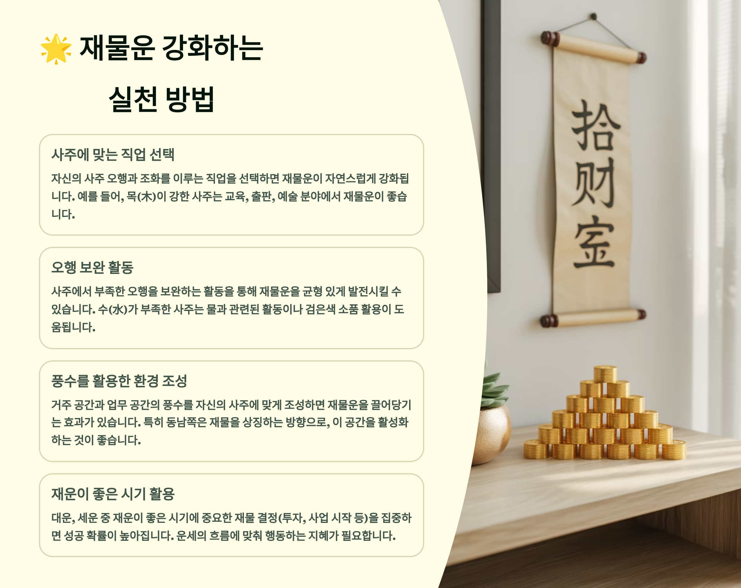 사주가 정해진 운명이라고 해서 노력이 무의미한 것은 아니에요. 오히려 자신의 사주를 알고 그에 맞는 노력을 하면 재물운을 극대화할 수 있답니다. 전통적인 방법부터 현대적인 해석까지, 재물운을 강화하는 실천 방법들을 소개해드릴게요!