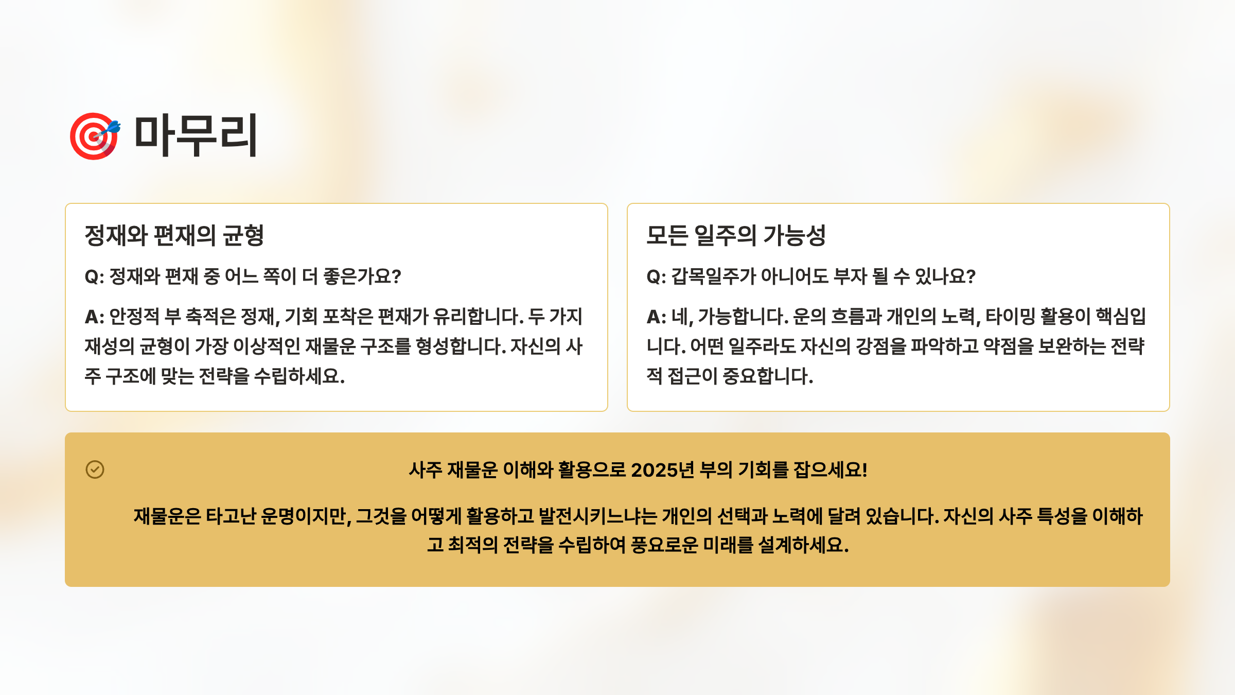 앞으로 여러분의 재물운이 활짝 열리기를 진심으로 응원해요! 🎊 오늘 배운 내용을 바탕으로 자신의 사주를 다시 한번 살펴보고, 숨겨진 재물운의 가능성을 발견해보세요. 작은 변화와 노력이 모여 큰 부를 이루는 계기가 될 거예요!