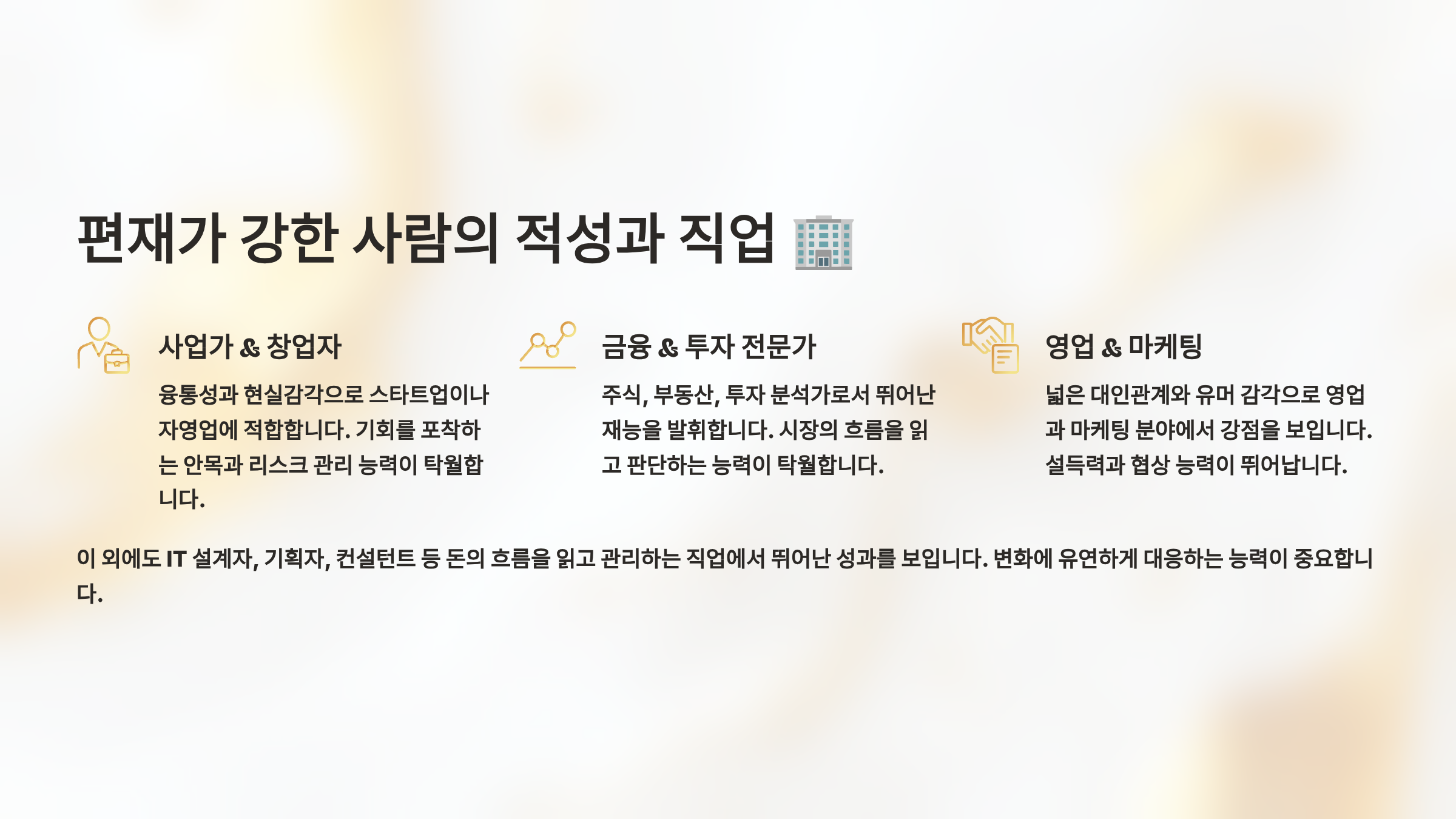 편재가 강한 사람들은 어떤 직업이 잘 맞을까요? 💼 가장 적합한 분야는 역시 '사업'이에요! 자영업, 스타트업 창업, 프랜차이즈 운영 등 자신이 주도적으로 비즈니스를 이끌어가는 일에 탁월한 능력을 발휘해요. 특히 트렌드에 민감하고 새로운 사업 기회를 빨리 포착하는 능력이 있어서, 신사업 개발이나 사업 확장에 강점을 보이죠. 실제로 유니콘 기업의 창업자들을 분석해보면 편재가 강한 사주를 가진 경우가 많답니다!