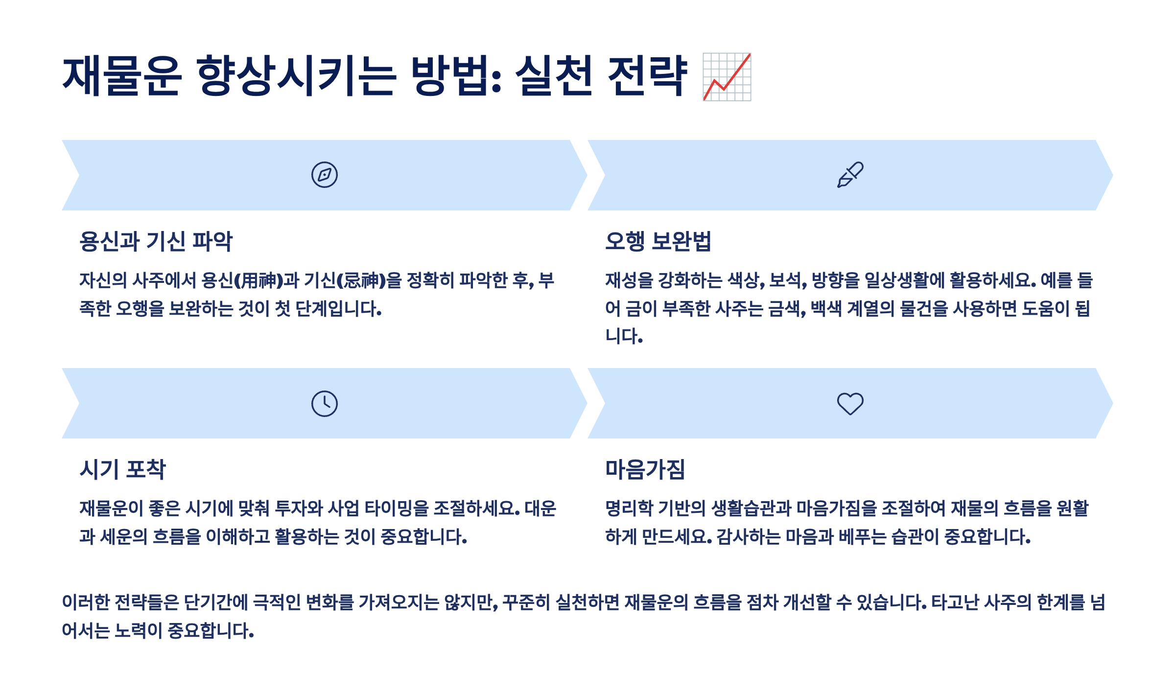 재물운이 좋은 사주를 가졌다고 해서 자동으로 부자가 되는 것도 아니고, 평범한 사주를 가졌다고 해서 가난하게 사는 것도 아니에요. 중요한 건 자신의 강점을 파악하고, 그에 맞는 노력을 꾸준히 하는 거예요.