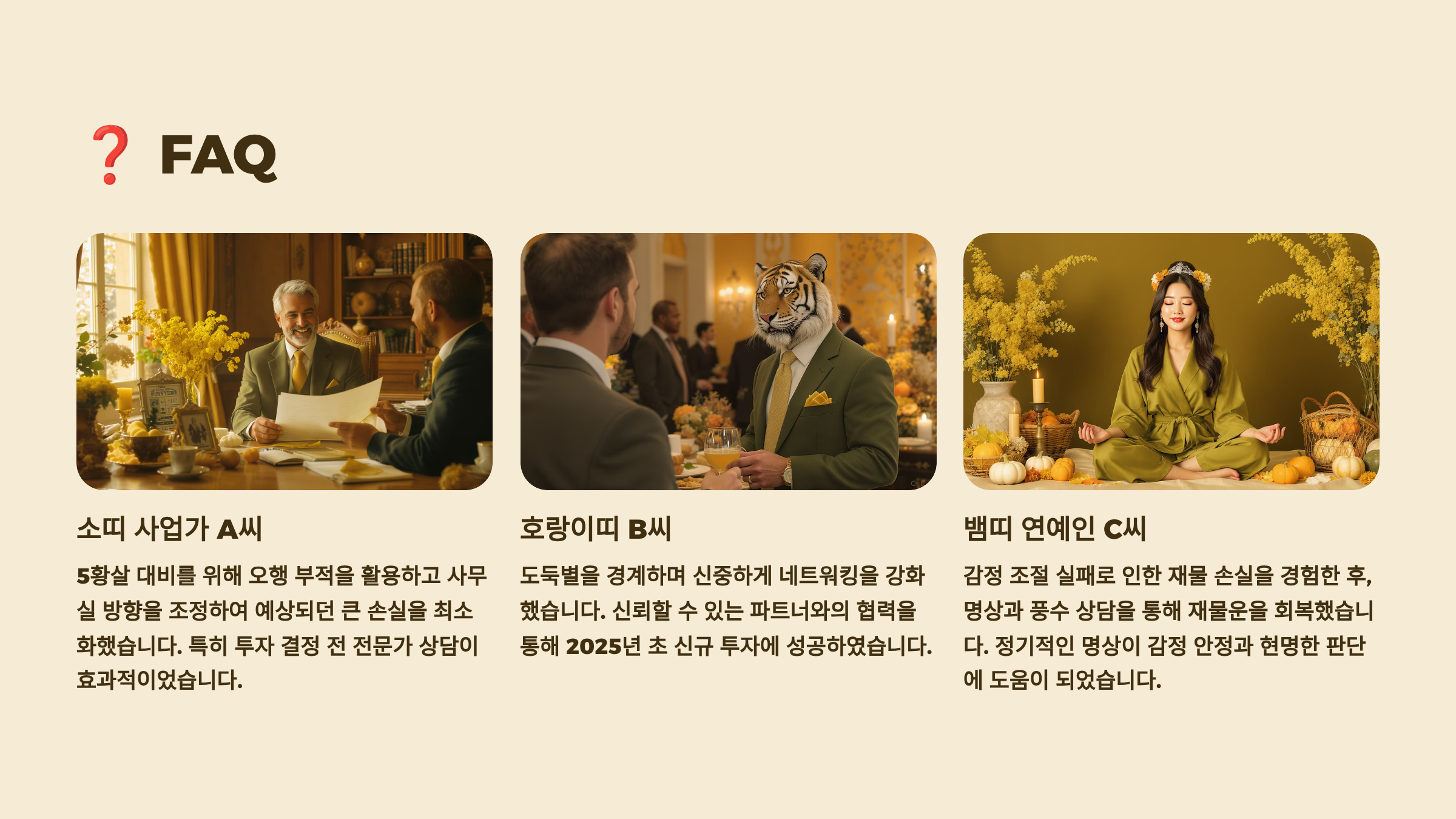 두 번째 사례는 부동산 투자를 하는 B씨(42세, 여, 무진일주)예요. B씨는 토일간으로 2025년 화생토의 좋은 기운을 받아요. 하지만 무작정 투자하지 않고 월별 운세를 참고해 3월과 5월에 집중적으로 매수했어요. 특히 동남쪽 지역의 부동산에 투자해 풍수적 이점까지 활용했죠. 결과적으로 6개월 만에 15% 수익을 달성했어요.