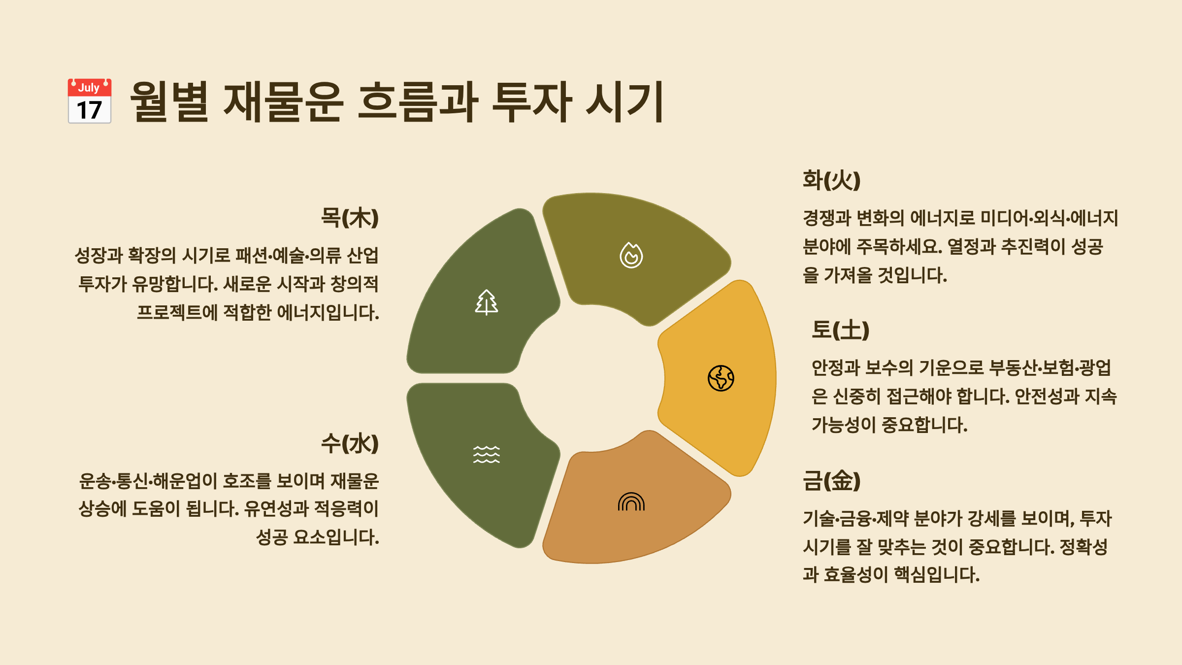 | 수(水) | 재물운 최상 | 무역, 물류, 서비스 | 과욕 경계 |