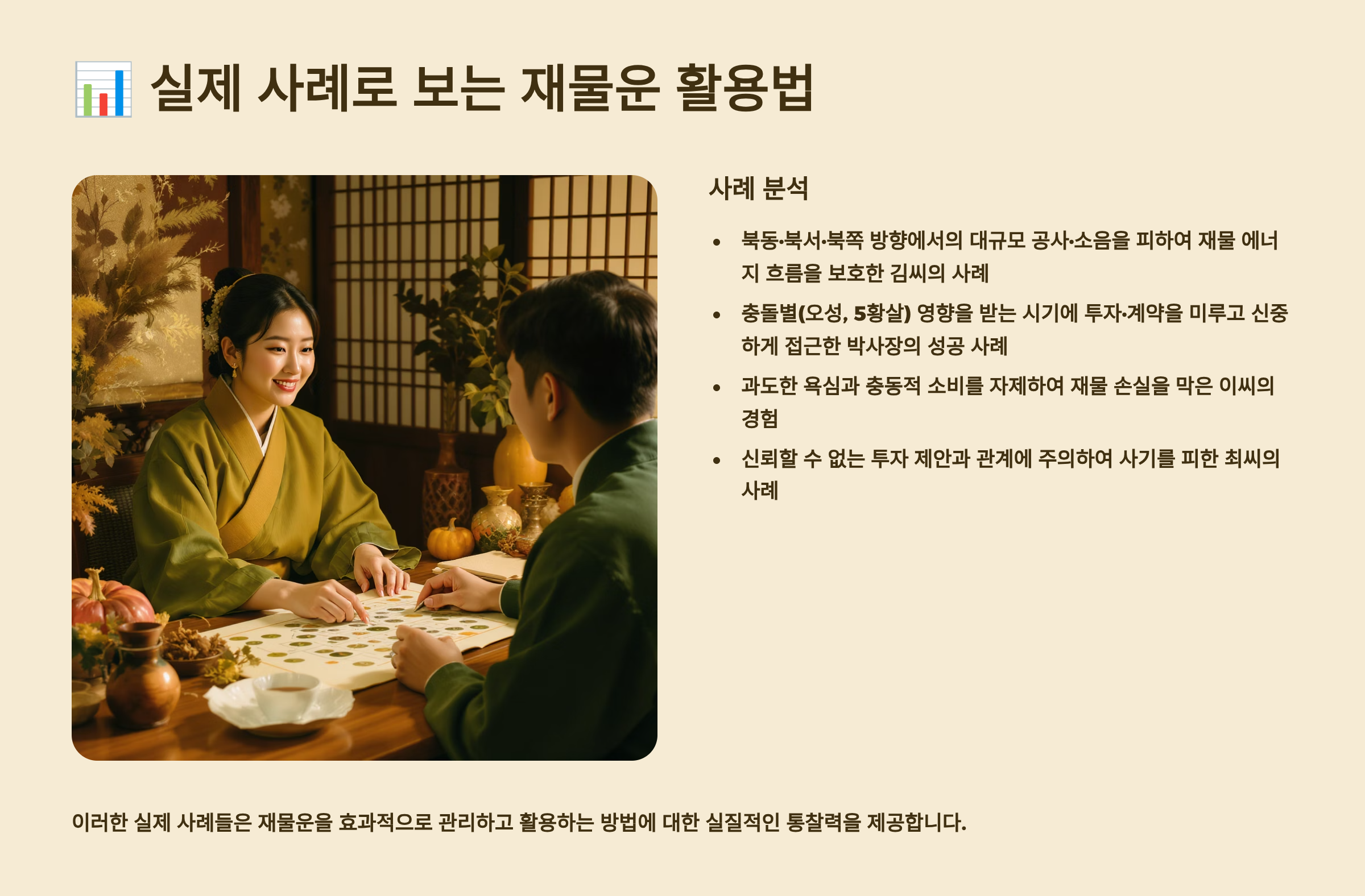 두 번째 사례는 부동산 투자를 하는 B씨(42세, 여, 무진일주)예요. B씨는 토일간으로 2025년 화생토의 좋은 기운을 받아요. 하지만 무작정 투자하지 않고 월별 운세를 참고해 3월과 5월에 집중적으로 매수했어요. 특히 동남쪽 지역의 부동산에 투자해 풍수적 이점까지 활용했죠. 결과적으로 6개월 만에 15% 수익을 달성했어요.